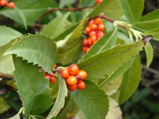 正月の飾りに欠かせないセンリョウは、鮮やかな赤い果実が美しい。